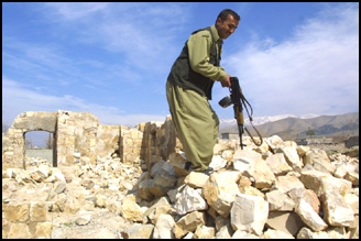 | One of Kevin McKiernan's bodyguards climbs over debris in Halabja,